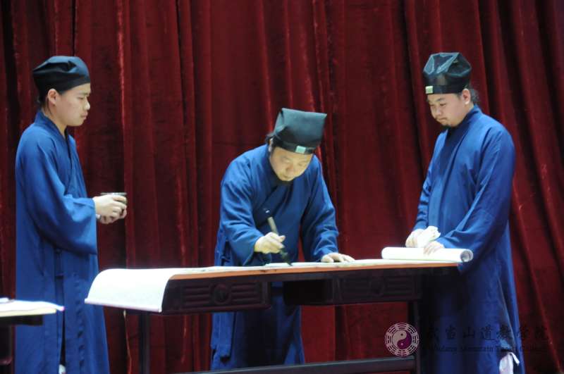 畢業(yè)晚會以道教特色文化呈現(xiàn)給所有的在場嘉賓。開篇道樂合奏《我的祖國》奔騰澎湃的道樂讓人印象極為深刻,玄靈飄逸的武當(dāng)武術(shù)太極拳、剛勁有力的書法現(xiàn)場展示、道教科儀《開天符》的展演讓大家對武當(dāng)山道教學(xué)院學(xué)生的專業(yè)技能有了直觀的了解和認(rèn)識。