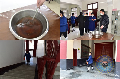 ▲喝中藥茶預防、進行學院內(nèi)消毒
