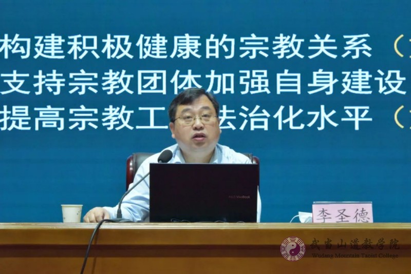 講座上,湖北省道教事務中心副主任李圣德,詳細講解習近平總書記在《全國宗教工作會議》的重要講話精神,全面闡述了新時代黨的宗教工作理論和方針政策,深刻分析了宗教工作面臨的新形勢。從多個方面對《全國全省宗教工作會議精神》進行了解讀和闡述。進一步加強了武當山道教學院全體師生對“宗教中國化”的認知與理解,提升了對黨的宗教工作理論和方針政策的認同感與信念度。將“宗教中國化”與社會實踐相結合,牢鑄中華民族共同體意識,樹立正確的愛國愛教理念,立足當下,爭做新時代大道文明體系的合格建設者與優(yōu)秀接班人。