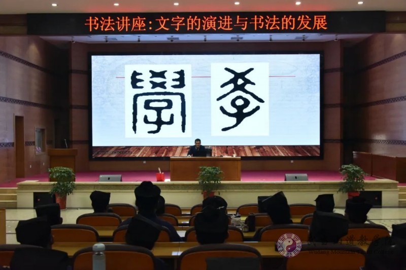 2023年3月20日下午,武當(dāng)山道教學(xué)院邀請(qǐng)武漢書法家協(xié)會(huì)楷書專業(yè)委員會(huì)副主任敖啟權(quán)來(lái)我院授課,以《文字的演進(jìn)與書法的發(fā)展》為題目,從文字的演變、書法的發(fā)展歷程、不同時(shí)期書法的寫作方式、區(qū)別、主要代表人物等細(xì)致地講解了中國(guó)書法的歷史與現(xiàn)狀。