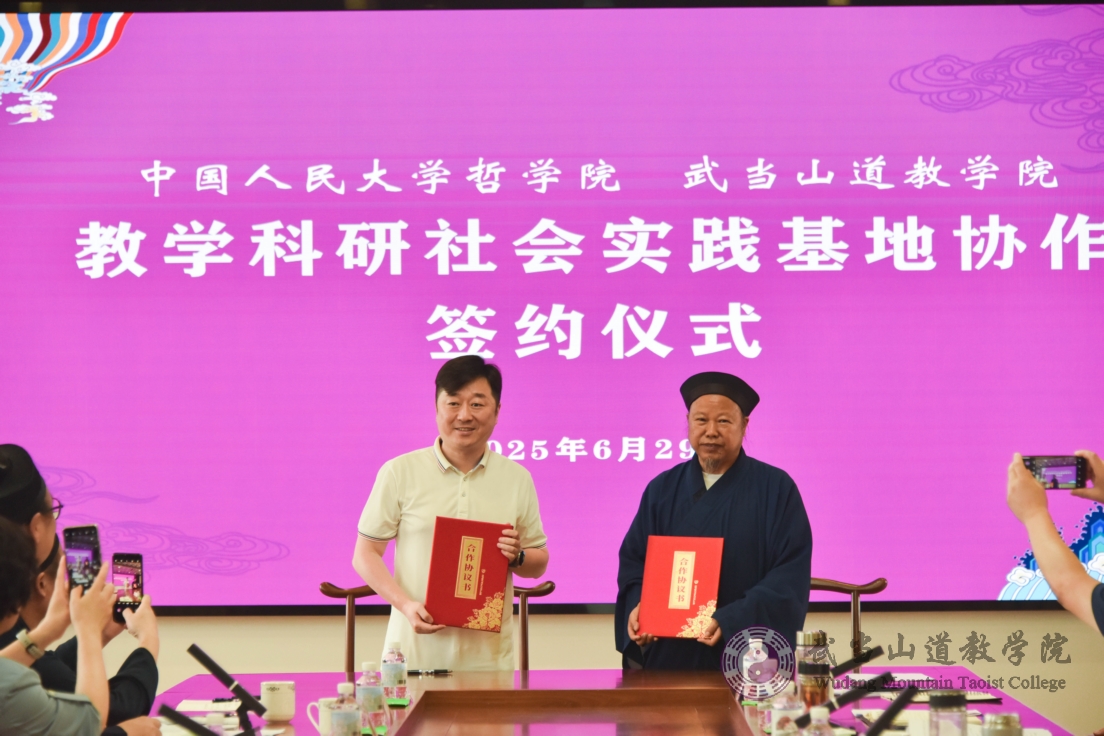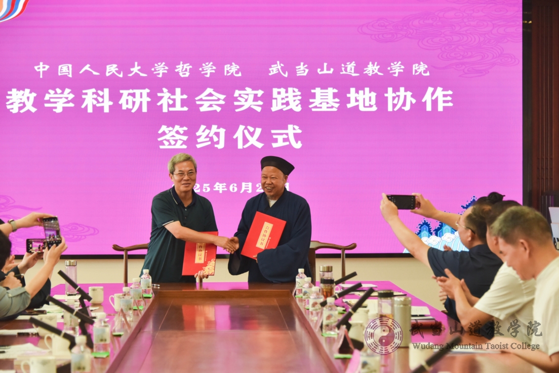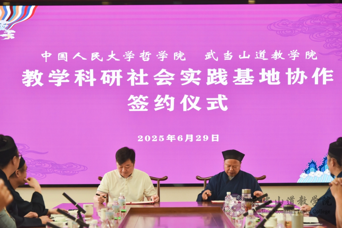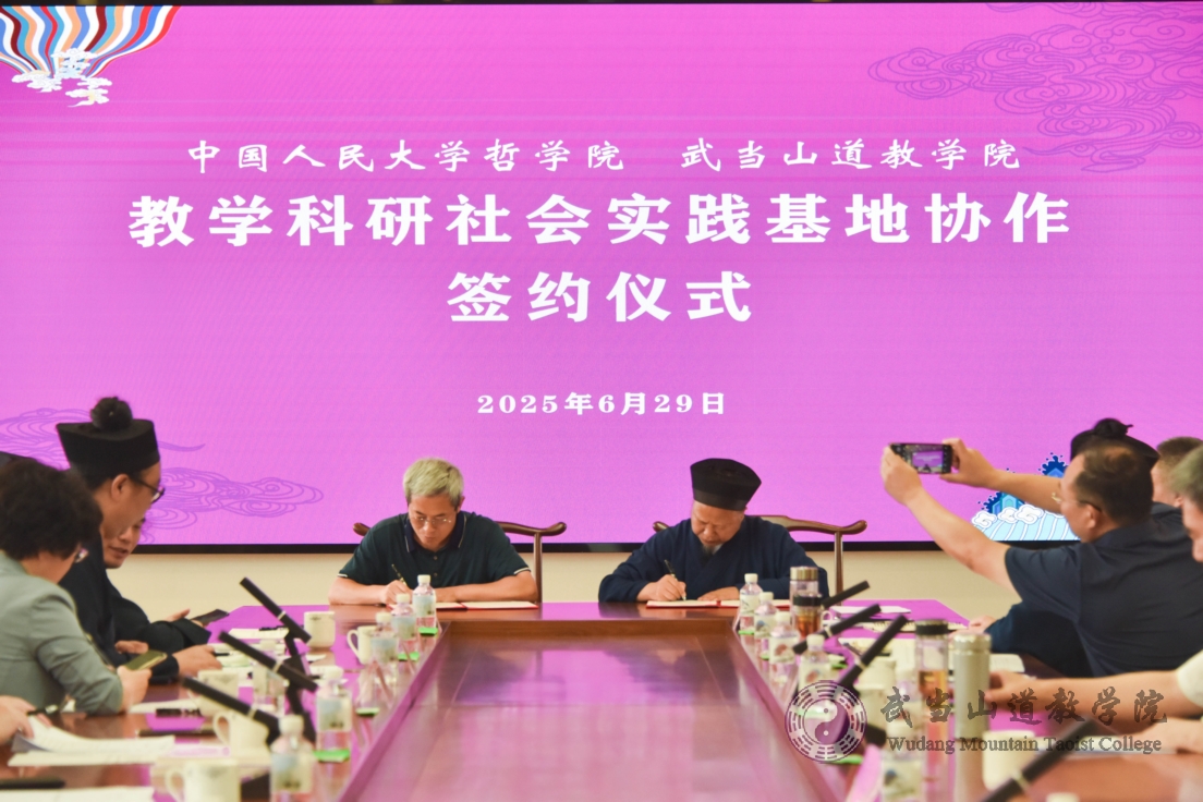 6月29日,中國(guó)人民大學(xué)哲學(xué)院與武當(dāng)山道教學(xué)院教學(xué)科研、社會(huì)實(shí)踐基地協(xié)作座談會(huì)暨共建簽約授牌儀式在武當(dāng)山道教學(xué)院成功舉行。
