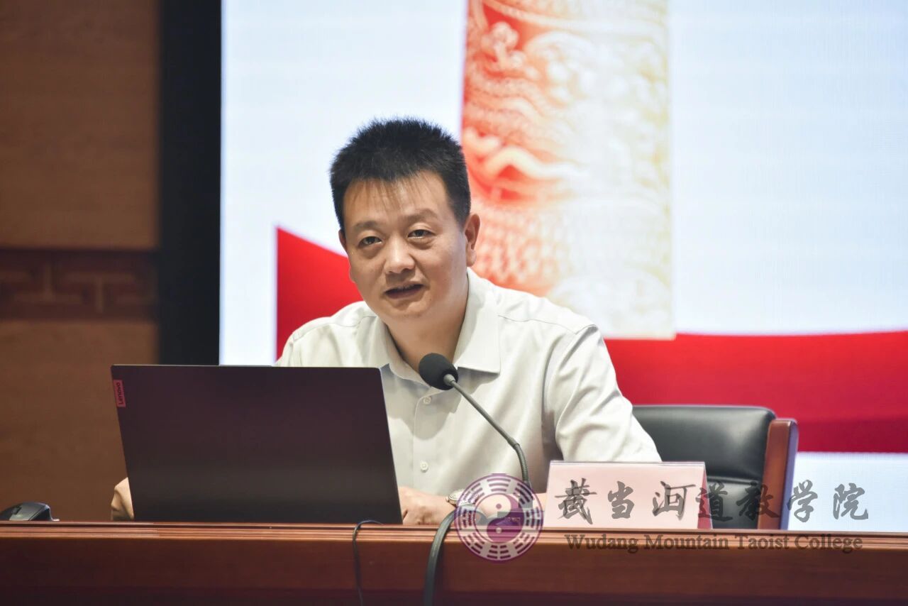 典禮結(jié)束后,湖北省民宗委宗教一處副處長(zhǎng)黃河為全體師生講授“開(kāi)學(xué)第一課”。他結(jié)合工作實(shí)際對(duì)宗教政策法規(guī)進(jìn)行了深入解讀,并從三個(gè)方面對(duì)學(xué)院發(fā)展提出指導(dǎo)建議:一是大力弘揚(yáng)抗戰(zhàn)精神,厚植愛(ài)國(guó)情懷,引導(dǎo)師生繼承光榮傳統(tǒng)、賡續(xù)紅色精神血脈;二是立足正確辦學(xué)方向,加快推動(dòng)宗教院校內(nèi)涵建設(shè)發(fā)展,持續(xù)提升學(xué)院管理水平和辦學(xué)質(zhì)量;三是堅(jiān)持全面從嚴(yán)治教,持續(xù)推進(jìn)我國(guó)宗教中國(guó)化實(shí)踐,為道教健康傳承與社會(huì)和諧發(fā)展貢獻(xiàn)力量。